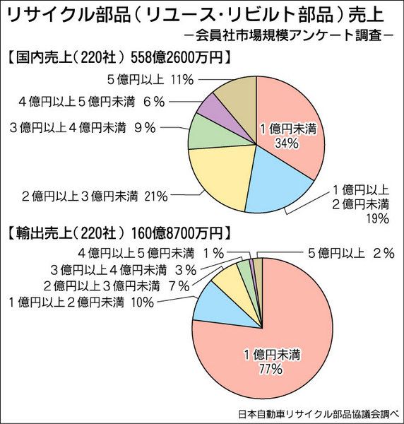 日本自動車リサイクル部品協議会(リ協、清水信夫代表理事)は6日、会員全体の市場規模を調査したアンケートをとりまとめ、その結果を公表した。会員全体のリサイクル部品(リユース・リビルト部品)の国内売上高は約558億2600万円、輸出売上高は1...