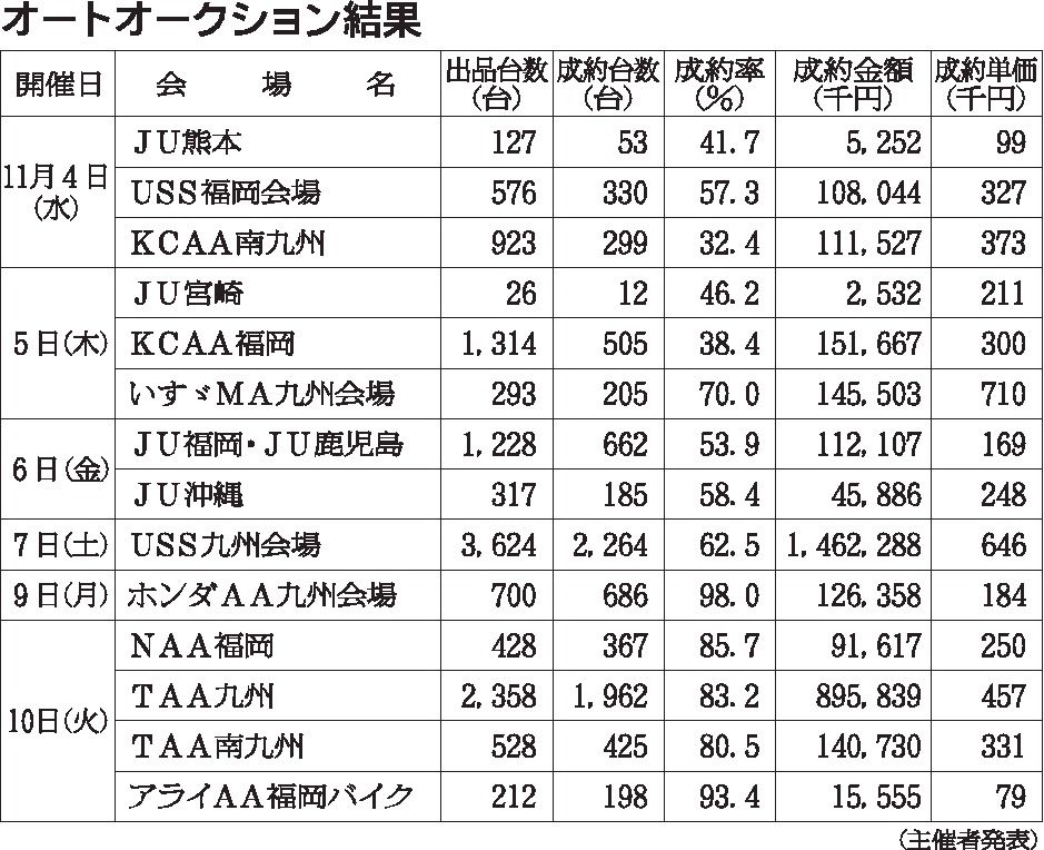 〈オートオークション結果〉九州地区 2020/11/4~10