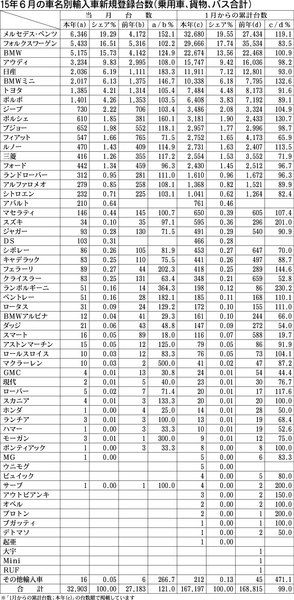 【15年6月の車名別輸入車新規登録台数(乗用車、貨物、バス合計)】