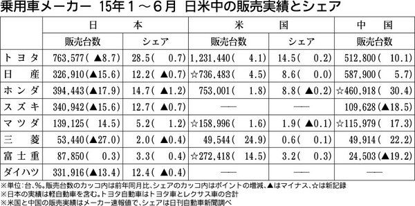 日本の乗用車メーカーの日本、米国、中国における2015年上期(1~6月)の販売がまとまった。3市場すべてでプラスとなったのはマツダのみだった。国内市場を中心に落ち込みが目立つが、日産自動車とマツダ、富士重工業は米国で、ホンダとマツダは中国...