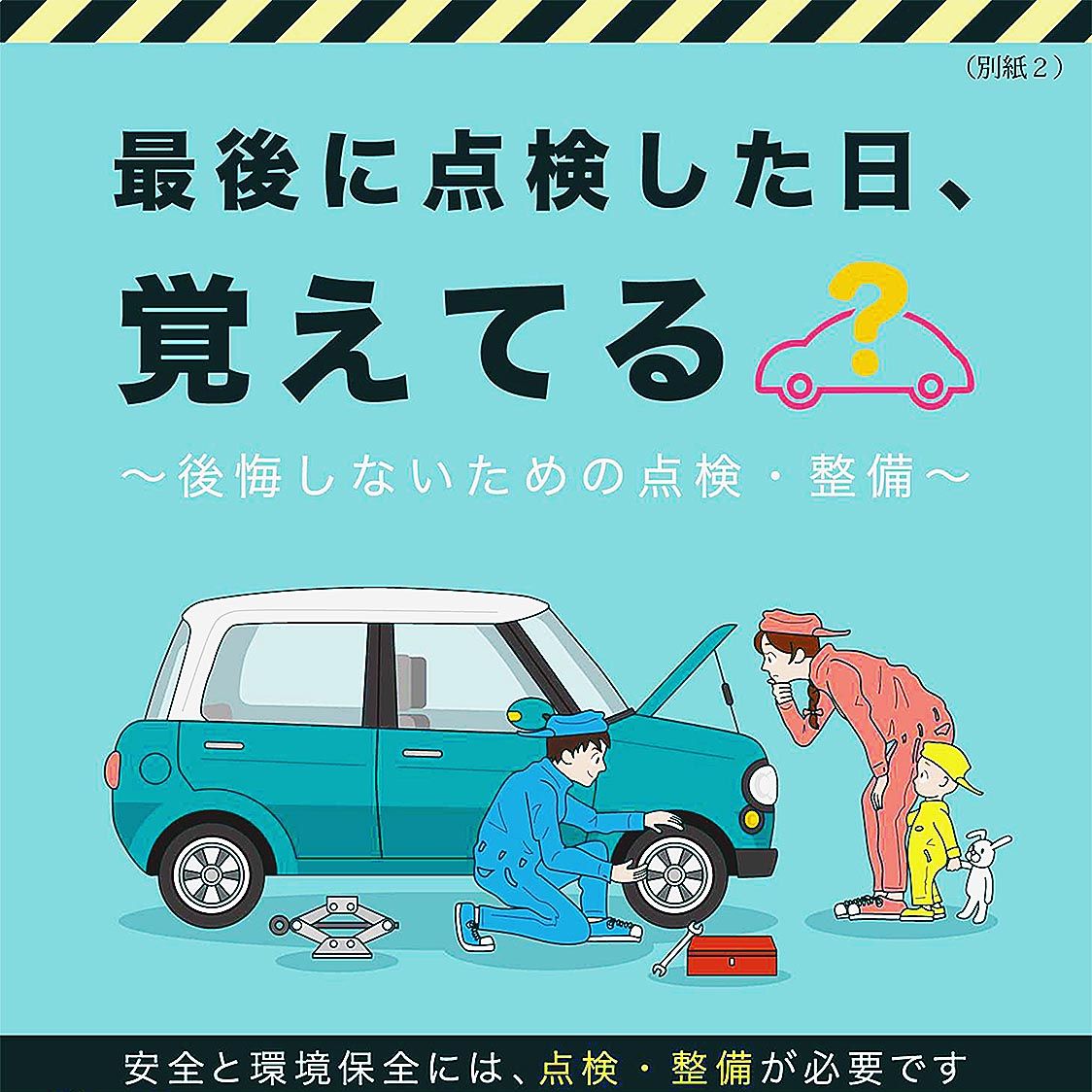 点検整備では10月末までの2カ月間を「自動車点検整備推進運動」の強化月間に位置づけ、自動車ユーザーの意識向上に取り組む。「最後に点検した日、覚えてる」と問いかけるポスターやチラシを制作、配布するとともに、各地の電光掲示板などでPR画像を掲示。人気キャラクターを起用したオリジナル動画を特設サイトで公開するほか、動画サイト「ユーチューブ」にも配信して幅広い層に点検、整備の重要性を訴える。