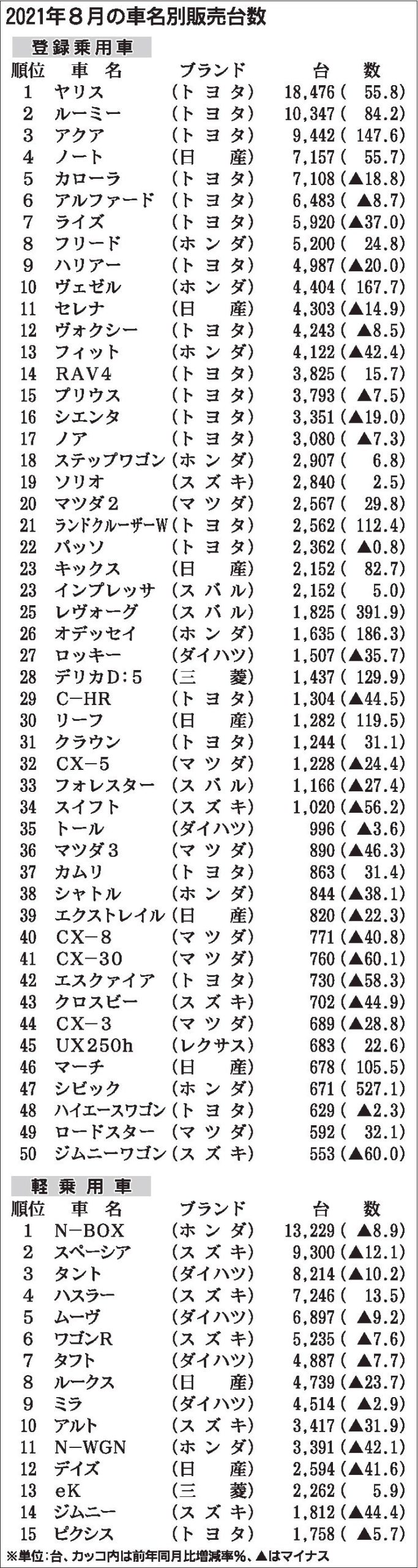 2021年8月の新車販売ランキング、「アクア」4位浮上 トップは「ヤリス」 軽自動車の落ち込み目立つ
