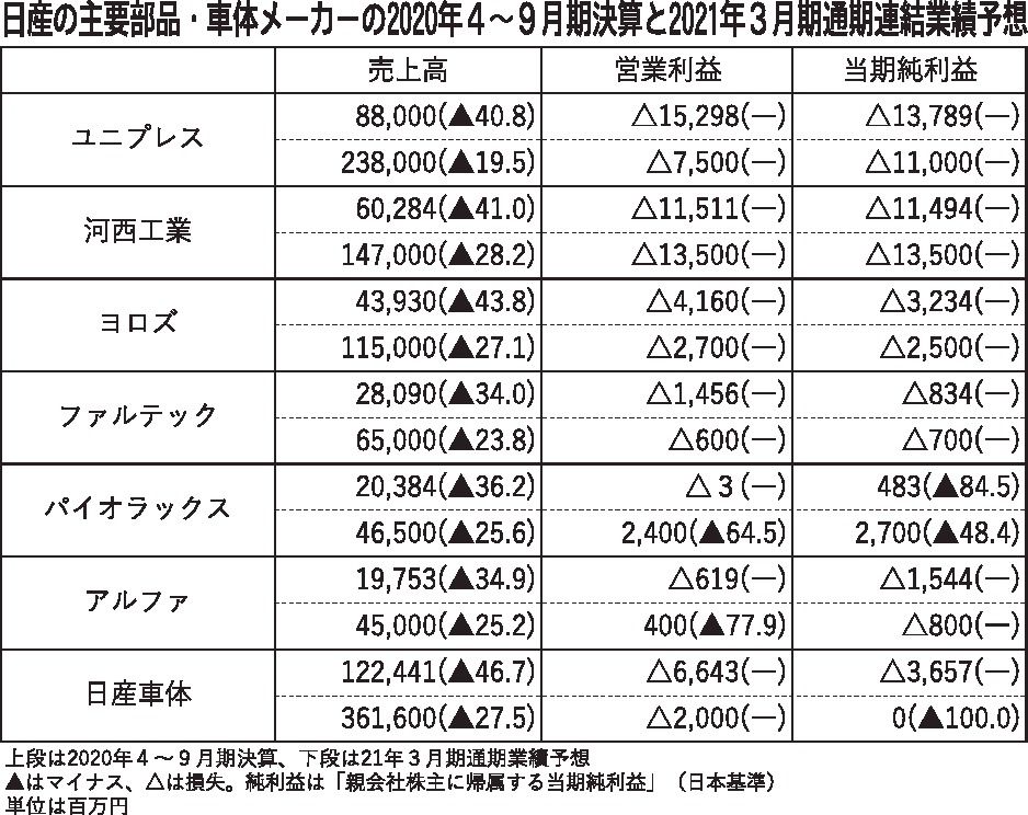 日産自動車の苦境がサプライチェーンにまで波及している。日産と取引の多い部品、車体メーカー7社の2020年4―9月期の連結決算は全社が減収となり、パイオラックスを除く6社が最終赤字に陥った。新型コロナウイルスの感染拡大で、自動車生産が世界規...
