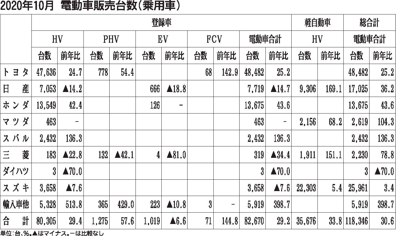 登録車と軽自動車を合わせた乗用車系のハイブリッド車(HV)や電気自動車(EV)など電動車の10月の販売台数は前年同月比30・6%増の11万8346台となり、9カ月ぶりにプラスに転じた。前年実績が消費税増税の影響でマイナスとなった反動から大...