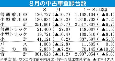 日本自動車販売協会連合会(自販連、天野洋一会長)が10日発表した8月の中古車登録台数は、前年同月比11・2%減の30万1628台で、2006年4月以来29カ月連続で減少した。8月単月としては1982年以来26年ぶりの低水準。自販連では「中...