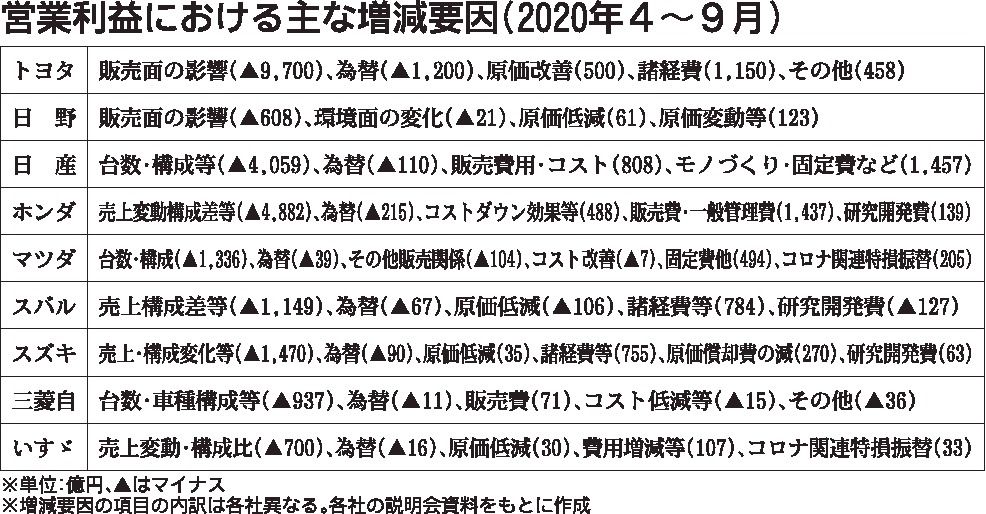 上場メーカー9社の2020年4~9月期新車販売台数は全体で5割近く減少したが、5社が営業黒字を確保した。リーマンショック後に磨いてきた収益力に加え、新型コロナウイルス感染拡大後の収益改善の積み重ねが奏功した。財務体質が悪化する日産自動車も...