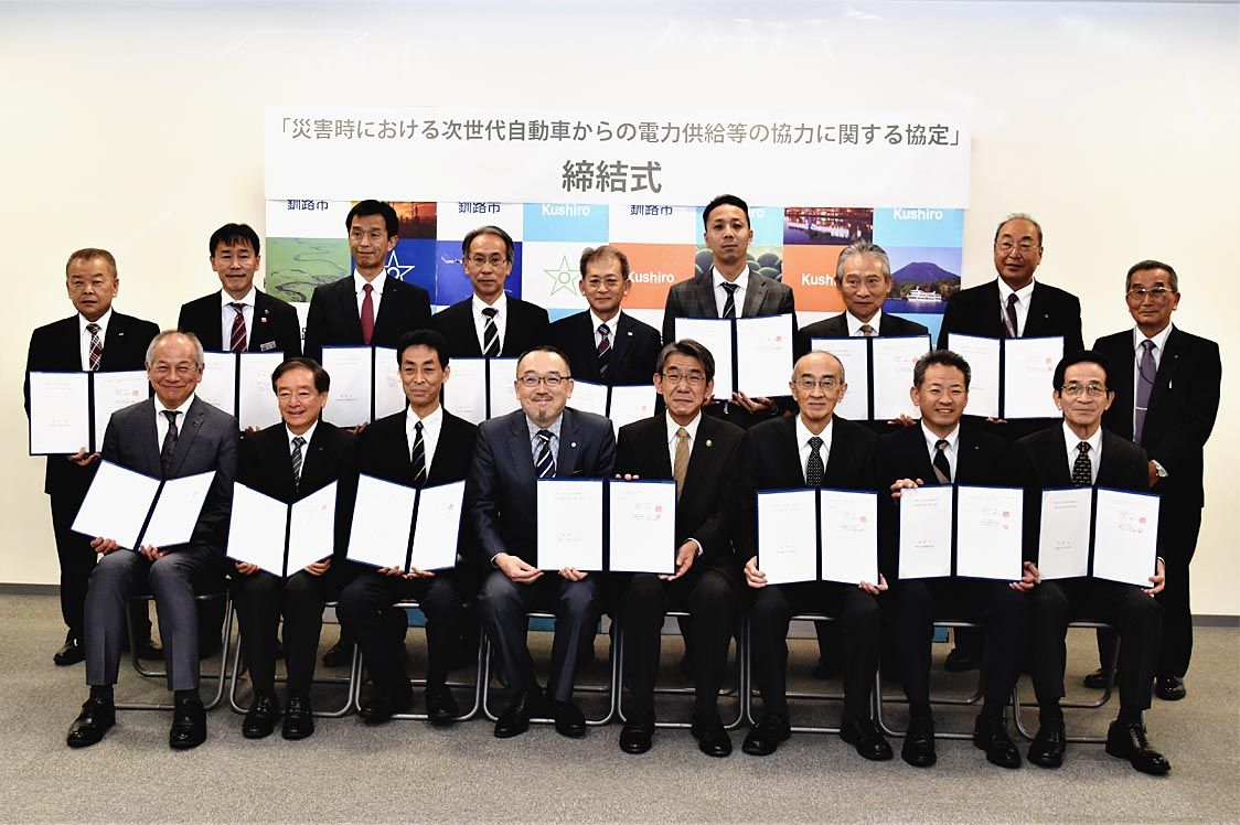 【釧路】釧路自動車販売店協会(坂根篤会長)の会員ディーラー15社は、釧路市と「災害時における次世代自動車からの電力供給等の協力に関する協定」を締結した。災害発生時、電動車による電力供給と店舗の開放や物資輸送用の貨物車貸与を行う。 釧路市防...