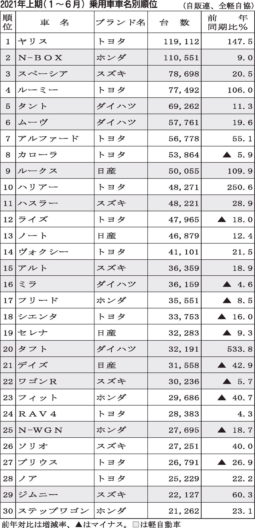 〈2021年上期(1~6月)乗用車車名別順位〉