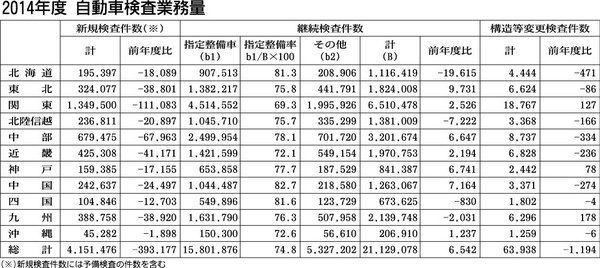 国土交通省は2014年度の自動車検査業務量をまとめた。14年度の新規検査件数は前年度比39万3177件減(8・7%減)の415万1476件、継続検査件数は6542件増(0・03%増)の2112万9078件だった。初回と2回目の車検対象台数...