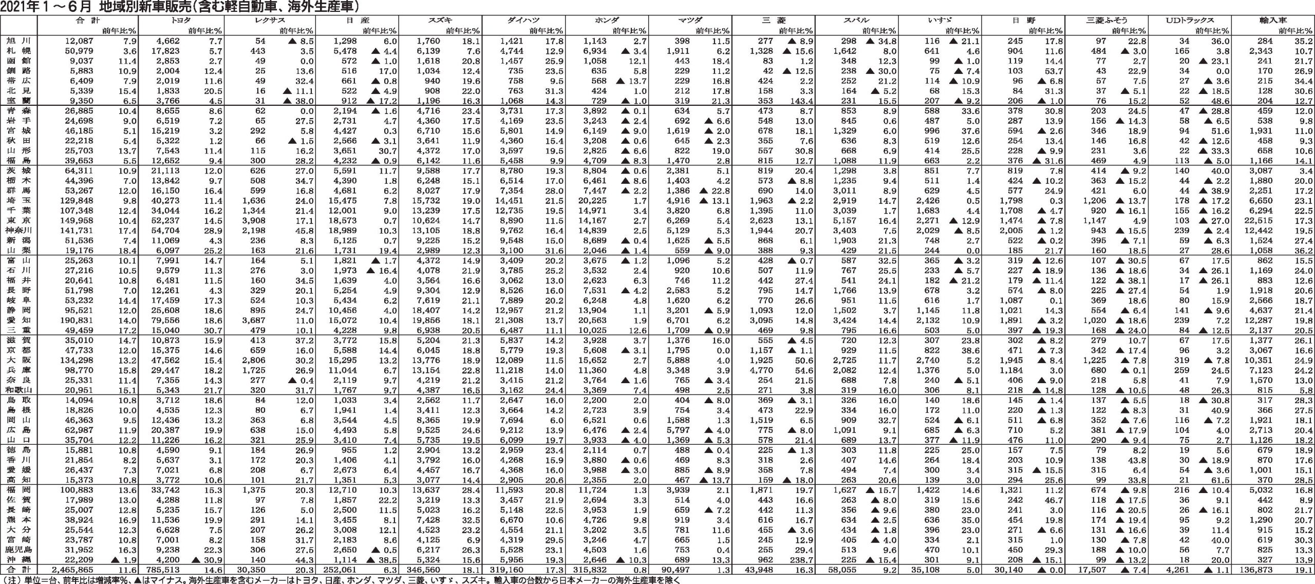 〈2021年1~6月 地域別新車販売(含む軽自動車、海外生産車)〉