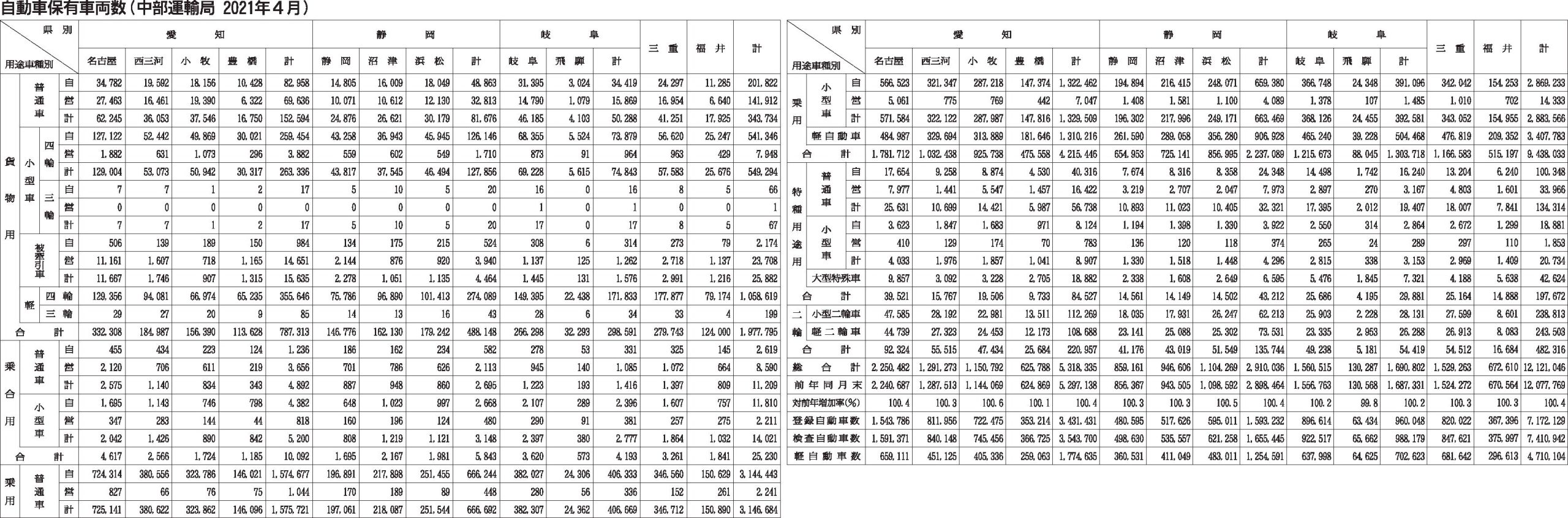 〈自動車保有車両数(中部運輸局 2021年4月)〉