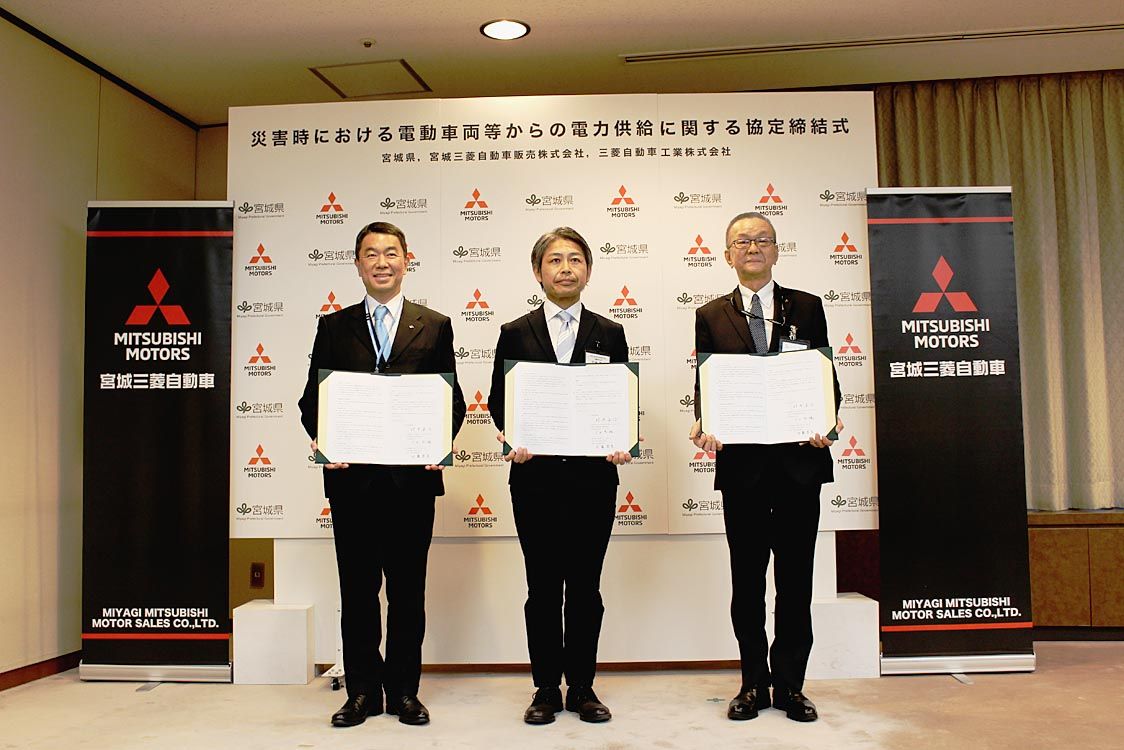 【仙台】宮城三菱(千田茂穂社長)と三菱自動車は、宮城県(村井嘉浩知事)と「災害時における電動車両等からの電力供給に関する協定」を締結した。今後、災害時に宮城県から要請があった場合は、宮城三菱が所有するPHV(プラグインハイブリッド車)など...