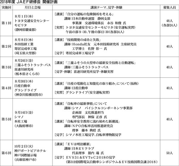 ■高校教諭対象 今年は全国6ヵ所で 日本自動車教育振興財団(内山田竹志理事長)は、全国の高校教諭を対象とした2018年度「JAEF研修会」を8月から10月まで実施する。先生たちの関心が高い自動運転や電動化、交通安全などをテーマに、今年度は...