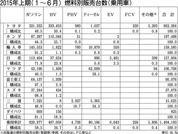 日本自動車販売協会連合会(自販連)が毎月発表する資料をもとに、2015年上期(1~6月)の登録乗用車の燃料別販売台数をまとめた。全体ではガソリン車が58・5%を占めて、ハイブリッド車(HV)が34・7%と続く。HVを戦略車としているトヨタ...
