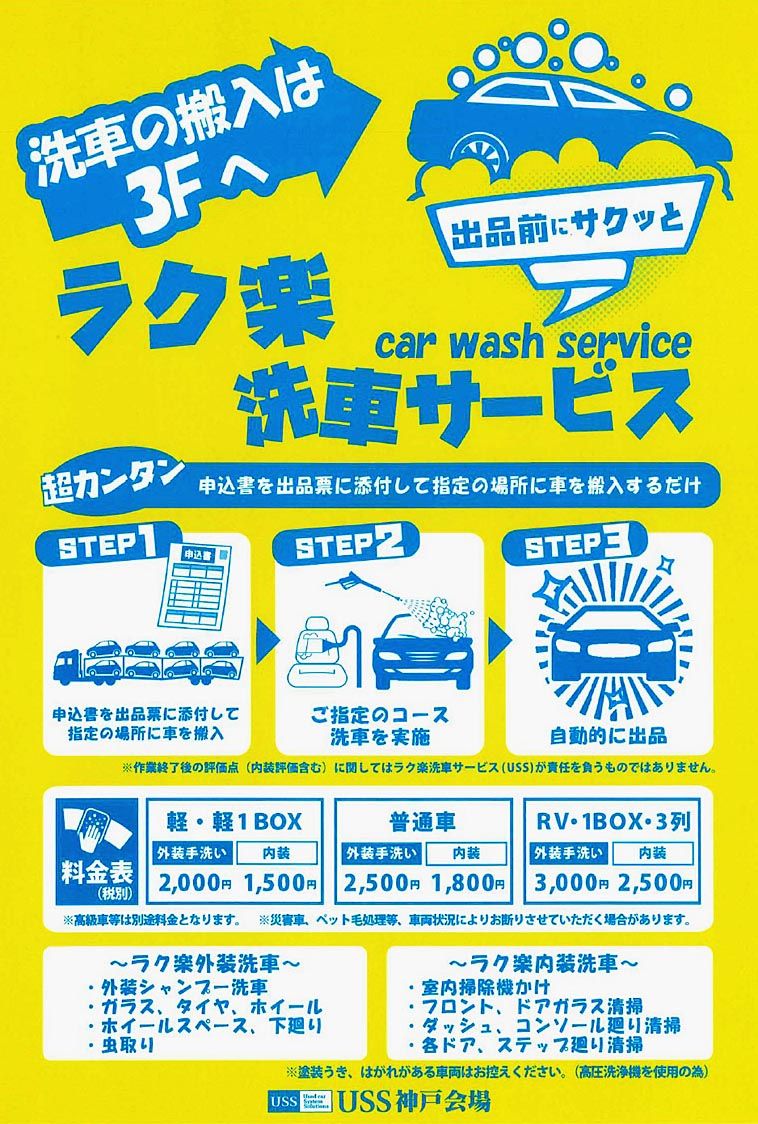 【神戸】USS神戸は、8日出品分から出品前の洗車を選択できる有料サービスをスタートした=写真。外装洗車および車内清掃のそれぞれを選択でき、出品前の手間を省くことで会員の利便性向上を図る。 同サービスは会員からの要望を反映したもの。「出品前...