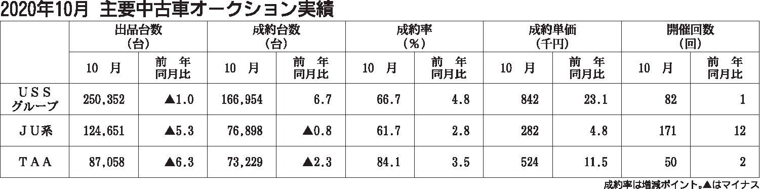 中古車オークション(AA)市場で成約率の高止まりが続いている。10月のAA3社の実績は、業界最大手のユー・エス・エス(USS)が成約率、成約単価ともに5カ月連続で前年を上回り、成約単価は4月以降で最も高かった。JU系が5カ月連続、トヨタオ...