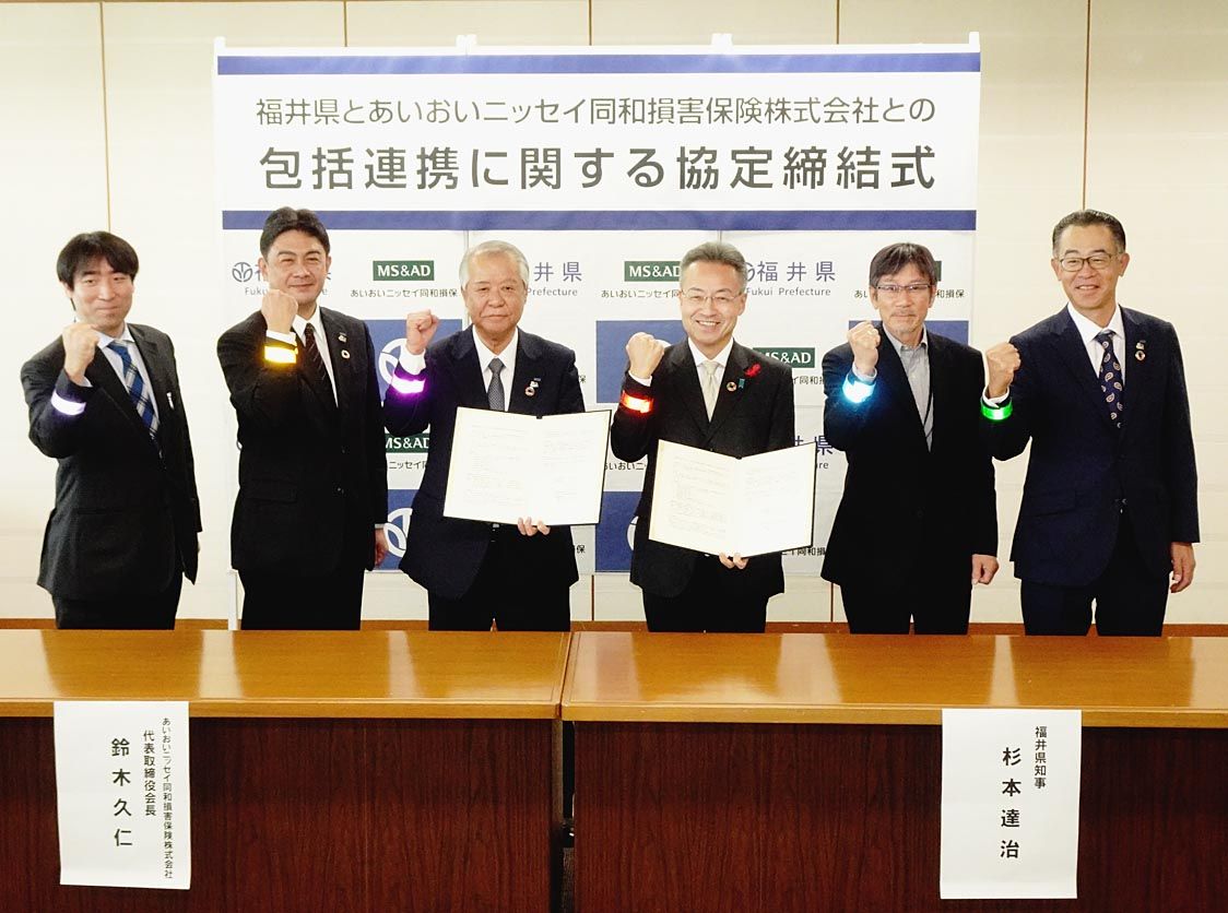 【福井】福井県とあいおいニッセイ同和損害保険は、交通安全対策などの連携を盛り込んだ「県政全般に係る包括的業務連携協定」を締結した。県庁(福井市)で協定締結式=写真=を行い、杉本達治知事と同社の鈴木久仁会長が協定書にサインした。また、県から...