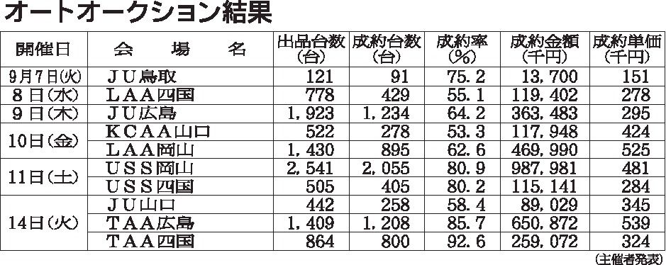〈オートオークション結果〉中四国地区 2021/9/7~14