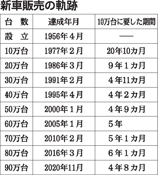 【さいたま】埼玉トヨペット(平沼貴之社長)は、1964年の設立からの累計新車販売台数が90万台に達した。直近の10万台の販売に要した期間は、同社として過去2番目に早い4年8カ月だった。過去最短は、小型車3兄弟の「コルサ」を販売していた40...