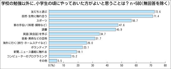 ■コミュニケーション力の醸成を重視 日本能率協会(JMA、中村正己会長)は、企業人600人に聞いた「小学生に向けた意識アンケート」を発表した。小学生時代に勉強以外でやっておくべきと思うことを挙げてもらった結果、7割以上の企業人が「友だちと...