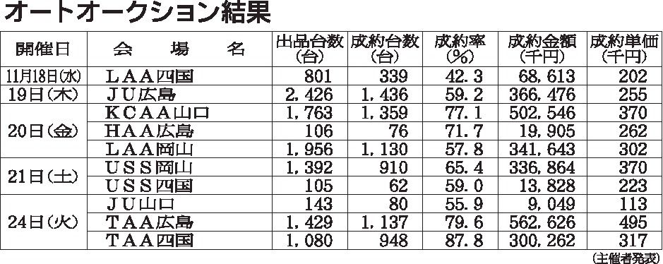 〈オートオークション結果〉中四国地区 2020/11/18~24