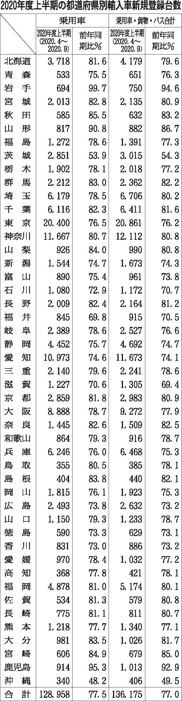 〈2020年度上半期の都道府県別輸入車新規登録台数〉