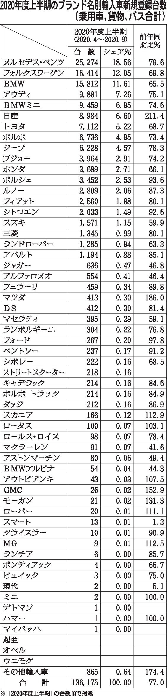 〈2020年度上半期のブランド名別輸入車新規登録台数(乗用車、貨物、バス合計)〉