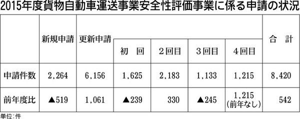 全日本トラック協会は「平成27年度貨物自動車運送事業安全性評価事業」として申請資格要件などをクリアした8420事業所の申請を受理した。新規申請は2264事業所、更新申請は6156事業所だった。 申請は全国貨物自動車運送適正化事業実施機関で...