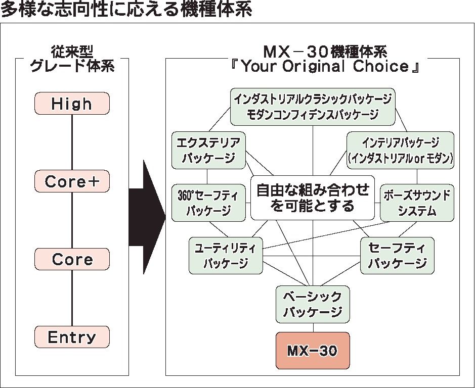 「MX―30」では、ターゲットとしている「固定観念にとらわれない自由な発想で物を選びたい層」のニーズに応えるため販売面でも新たな手法を取り入れた。その代表例がグレード展開の見直しだ。選択肢を広げるためにグレードは1機種に絞り込んだ上で、顧...