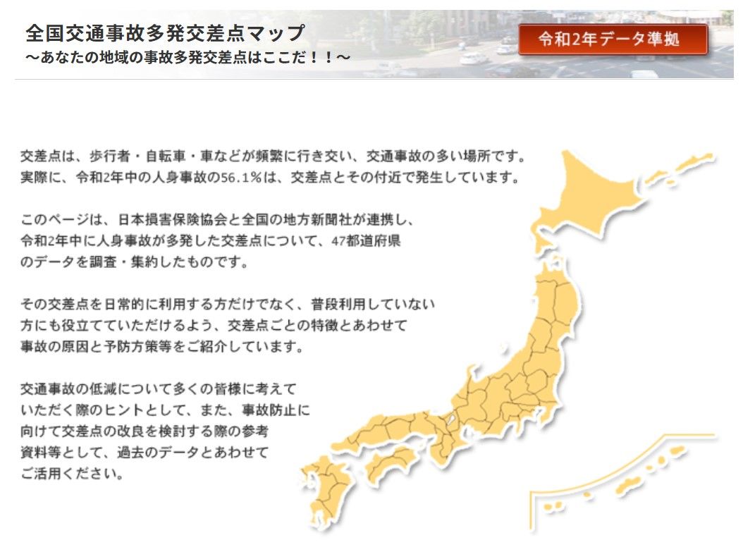 日本損害保険協会は、協会のホームページに掲載している「全国交通事故多発交差点マップ」を更新したと発表した。2020年の人身事故発生件数は法円坂交差点(大阪市中央区)と針摺交差点(福岡県筑紫野市)が、ともに22件で全国最多となった。