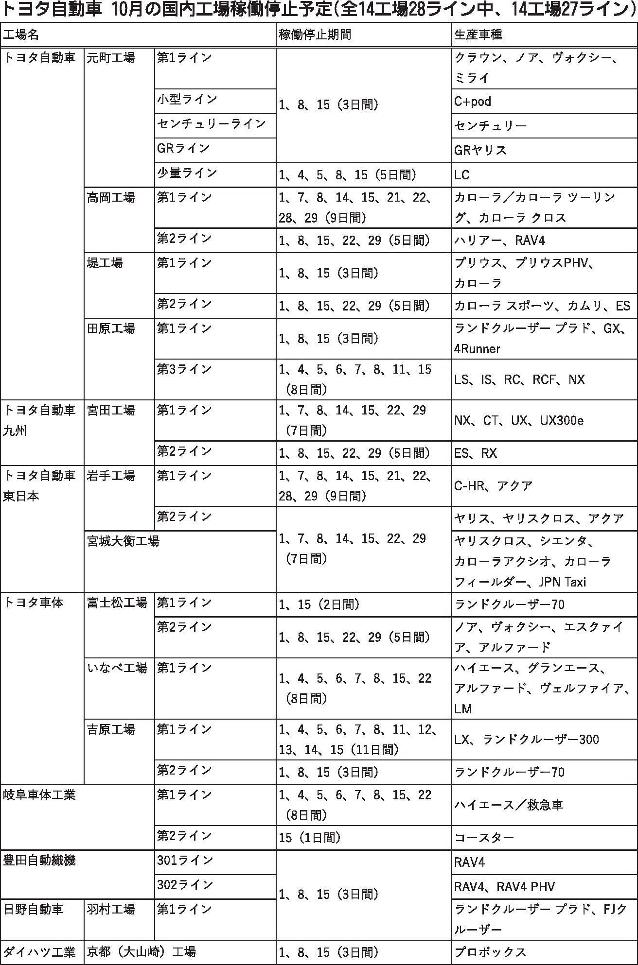 〈トヨタ自動車 10月の国内工場稼働停止予定(全14工場28ライン中、14工場27ライン)〉