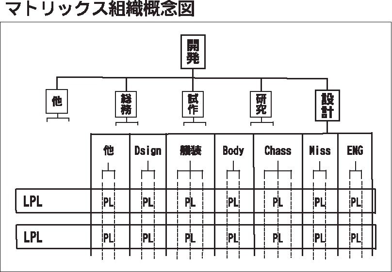 ホンダの4輪開発はマトリックス組織で行われていた。 それは、「シビック」とか「アコード」という商品開発を担う横刺しチームに、エンジン・ボディなどの機能開発を担う縦組織の室課からメンバーを提供する形で構成され、そのまとめ役をPLと呼んで、機...