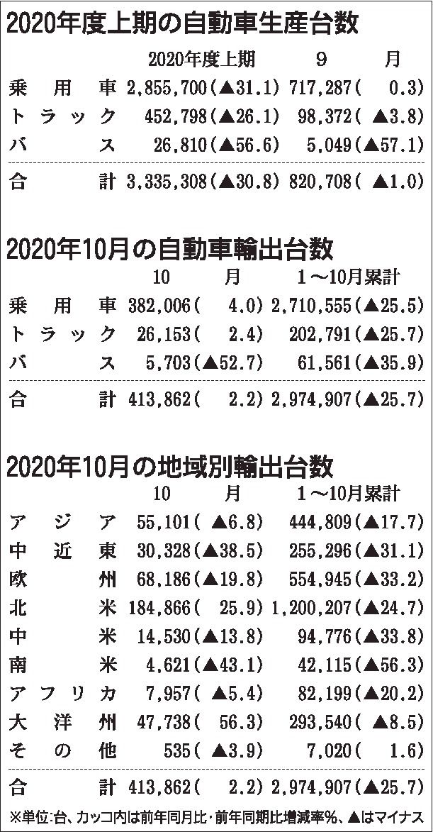 同日発表した2020年度上期(4~9月)の国内自動車生産台数は前年同期比30.8%減の333万5308台、9月単月では前年同月比1.0%減の82万708台だった。