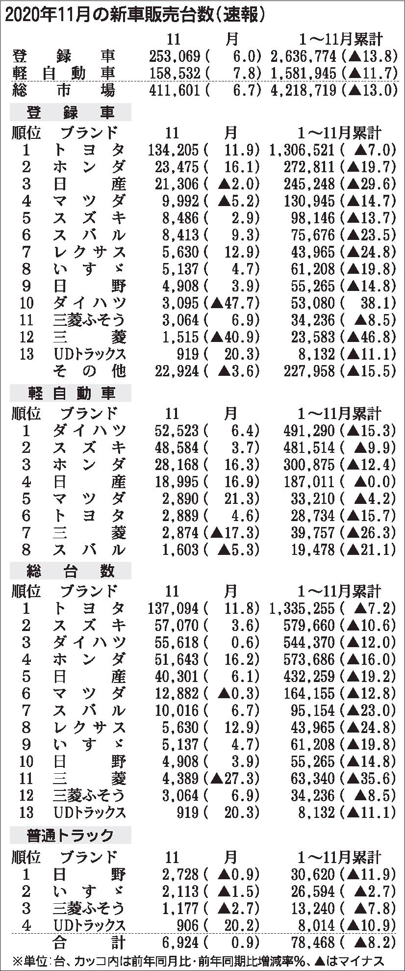 2020年11月の国内新車販売、受注好調で6.7%増 通年では460万台前後の見通し
