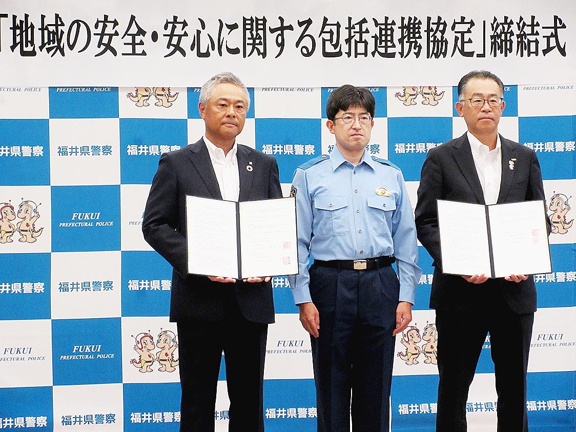 【福井】あいおいニッセイ同和損害保険や東京海上日動火災保険は、福井県警察本部と「地域の安全・安心に関する包括連携協定」を締結した。県警が損害保険会社と包括的に協定を結ぶのは北陸地方で初めて。社会貢献の一環で、幅広い分野において情報を共有し...