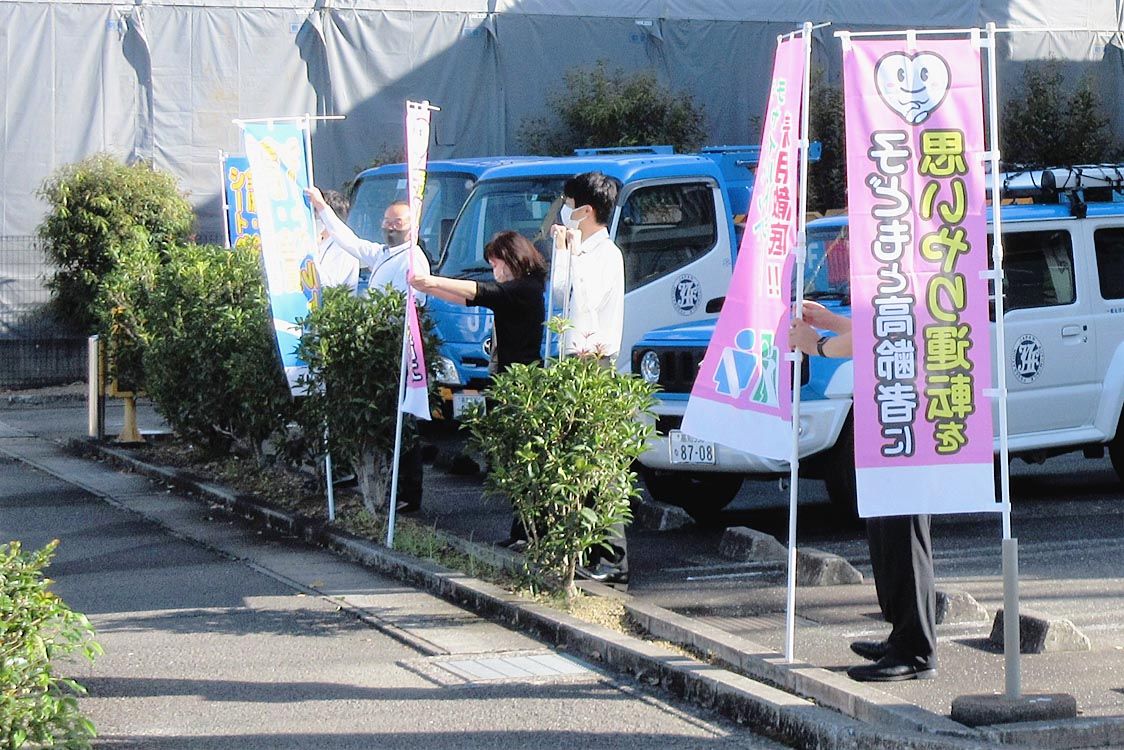 【高知】日本自動車連盟(JAF)高知支部(佐藤誠三支部長)は、高知市内の同支部前で「秋の全国交通安全運動」街頭活動を実施した=写真。通勤などのドライバーに対し、「全席・全員シートベルト着用」や「思いやり運転」のメッセージを記した幟をスタッ...