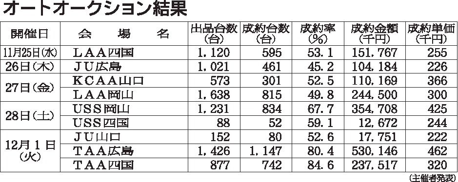 〈オートオークション結果〉中四国地区 2020/11/25~12/1