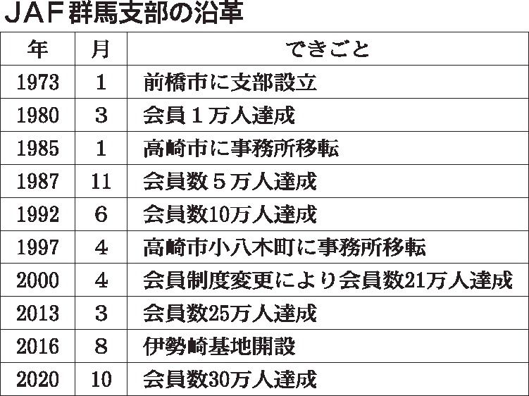 【前橋】日本自動車連盟(JAF)群馬支部(大山駿作支部長)は、JAF在籍会員数が30万人を突破した。1973年の支部設立から47年10カ月での達成となった。 同支部は、社会情勢の大きな変化の中で、会員のJAF諸活動への理解と県内自動車販売...