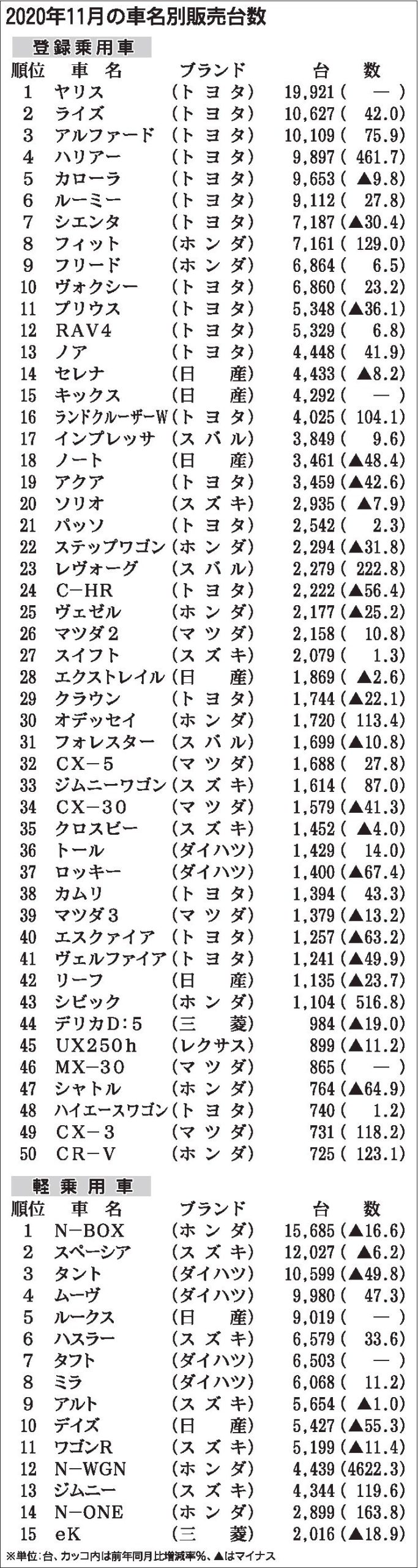 2020年11月の国内新車販売ランキング、「ヤリス」3カ月連続首位 登録車はトヨタ車が1~7位独占