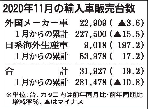 また、外国メーカー車の1~11月の累計台数は前年同期比15.5%減の22万7500台だった。12月を前年並みと想定した場合、20年1~12月の販売台数は26万台前後になると予想される。