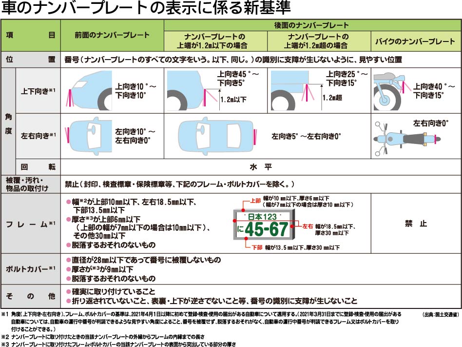 コロナ禍で猶予期間が設けられていたナンバープレート表示に関する新基準が10月1日から全面適用され、取り付け角度やナンバーフレームの基準が明確化された。違反すると道路交通法に基づく処分(点数、反則金)のほか、道路運送車両法違反(懲役、罰金)にも問われかねない。自動車や主な用品メーカーは対応を終えているが、カスタマイズ(合法改造)事業者などは注意が必要だ。