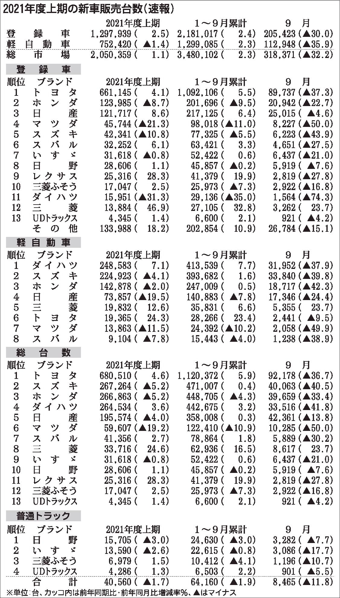 〈2021年度上期の新車販売台数(速報)〉