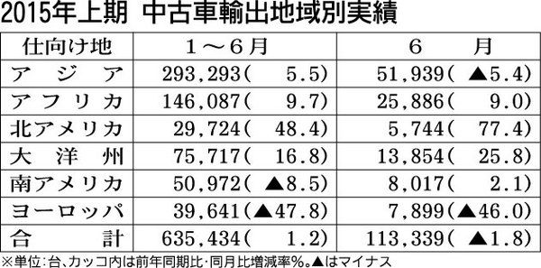 日本中古車輸出業協同組合(中輸協、佐藤博理事長)が30日に発表した2015年上期(1~6月)の中古車輸出台数は、前年同期比1・2%増の63万5434台で、東日本大震災の影響を受けた11年上期(1・9%増)以来の低い伸びにとどまった。足かせ...