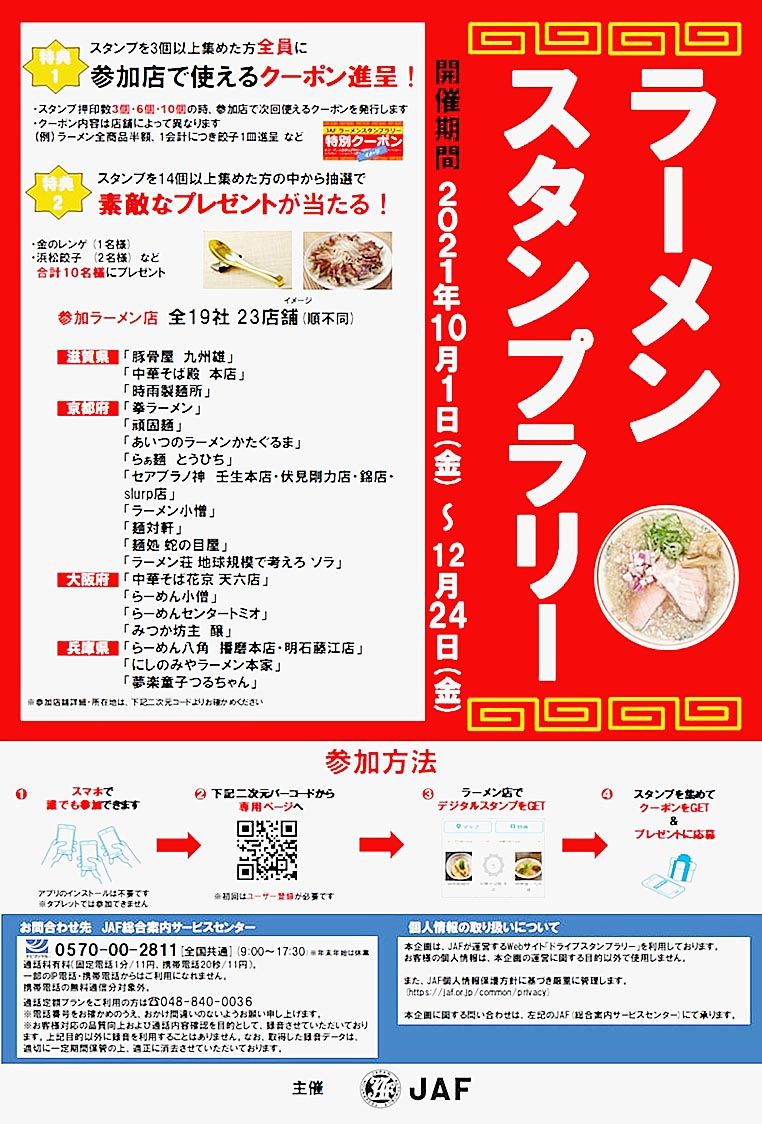 【京都】日本自動車連盟(JAF)京都支部(奥田俊彦支部長)は、スマートフォン(スマホ)を用いた「ラーメンスタンプラリー」を1日から開催した=写真。近畿4府県の人気ラーメン店23店舗を巡った数に応じて「浜松餃子」などのプレゼントが当たる。 ...