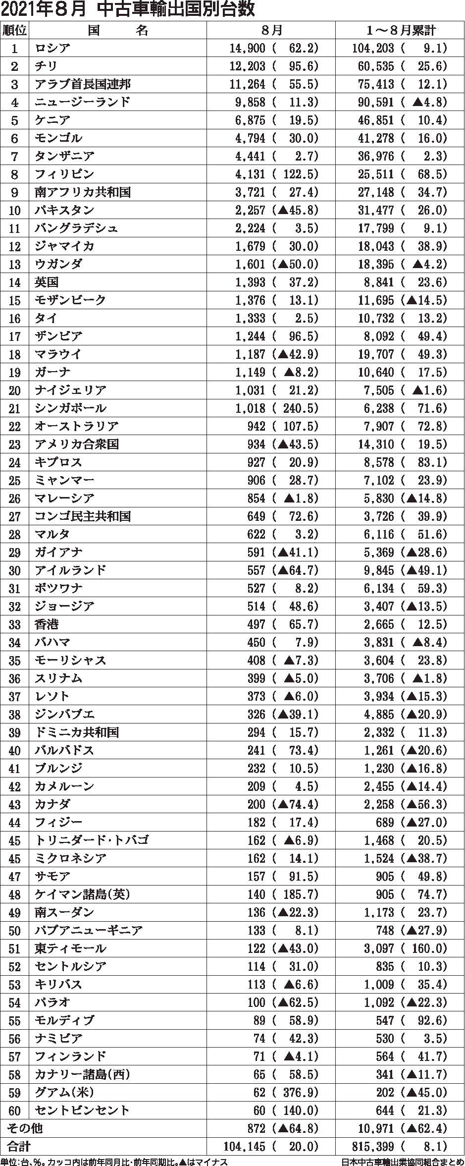 日本中古車輸出業協同組合(佐藤博理事長)がまとめた2021年8月の中古車輸出台数は、前年同月比20・0%増の10万4145台だった。前年同月実績を上回るとともに10万台の大台を超えたのは5カ月連続。一昨年の19年8月実績比では5・7%増だ...