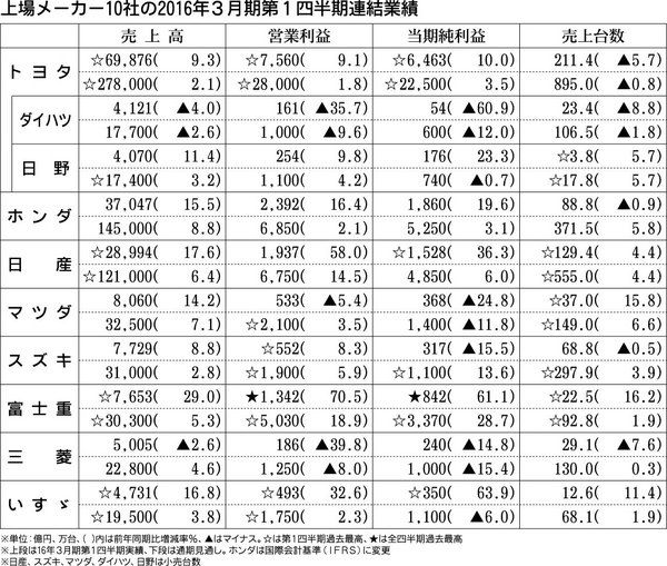 上場している自動車メーカー10社の2015年4~6月期(1Q)連結決算が出そろった。国内事業で苦戦が目立ったものの、北米事業など海外主力市場の好業績にけん引される形で8社が増収、7社が営業増益となった。米ドルに対する円安効果による収益の押...