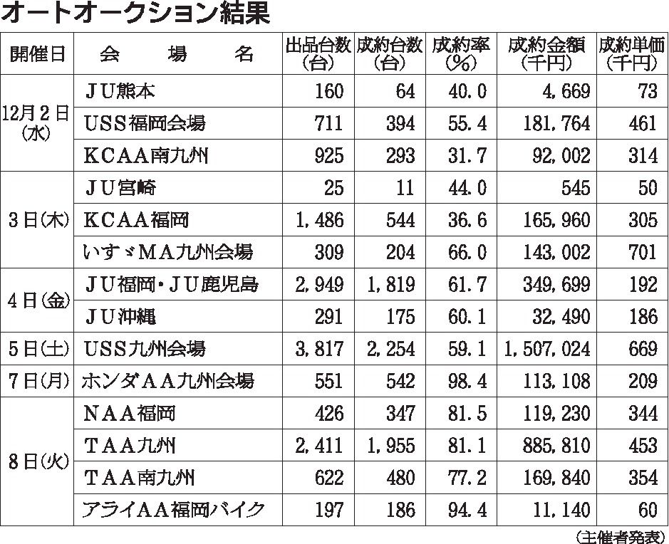 〈オートオークション結果〉九州地区 2020/12/2~8