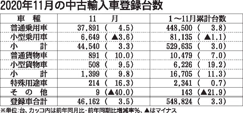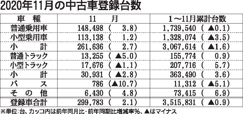 日本自動車販売協会連合会(自販連、加藤和夫会長)が10日に発表した11月の中古車登録台数は、前年同月比2・1%増の29万9783台と、2カ月連続で前年を上回った。前年実績が消費税増税の影響で落ち込んでいたことや、小売り需要が回復傾向にある...