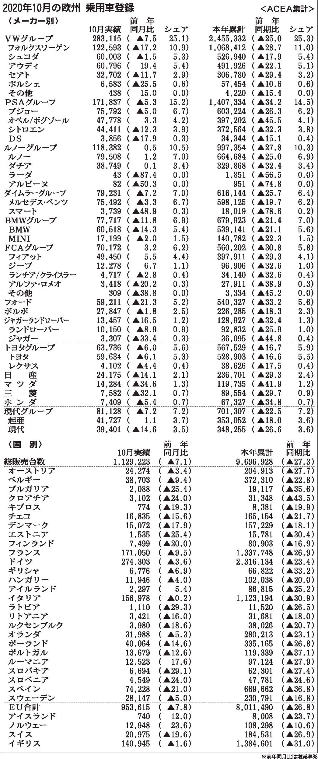 〈2020年10月の欧州 乗用車登録(ACEA集計)〉