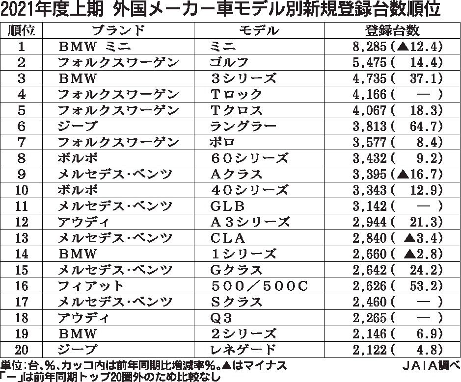 最近の新型車では、20年6月に投入したMB「GLB」が11位、同7月に投入したVW「Tロック」が4位と、いずれも2期連続でトップ20入りし、SUV人気の根強さを裏付けた。トップ20のうち、SUV専用車は前年同期より1車種増え、7車種だった。